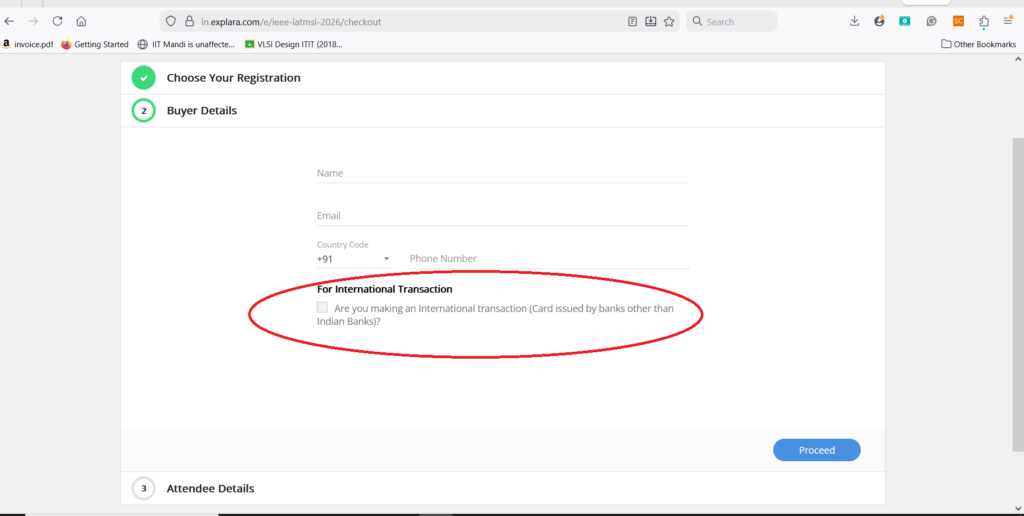 Step 3: Fill the buyer details and Attendee Details. Note thatyou have to select the international transaction mentioned in the buyer details (rounded in red in the picture below). Then you have to fill in the details like country, state, address, etc.