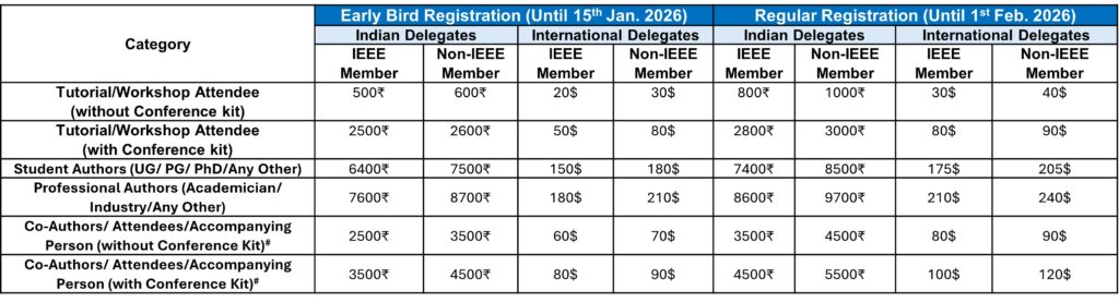 - Registration fees of all categories except tutorial include a registration kit, Presentation slot, Refreshments (Morning and Evening) and 3 Lunches, Copy of Conference Proceedings (Soft Copy), Certificate, Eligibility for all technical sessions, cultural event coupons and one-day Gala dinner coupon. A registration kit will be provided only to the offline attendees.
